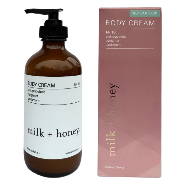 HYDRATE. Milk + Honey Body Cream No. 16 is a luxuriously rich, antioxidant-packed moisturizer that nourishes deeply without leaving an oily finish. Crafted with aloe juice, shea butter, and coconut oil, it softens and restores skin while a bright essential oil blend of pink grapefruit, bergamot, and cardamom uplifts your mood. Non-toxic, cruelty-free, and made in Austin, TX, this cream is as safe as it is indulgent.