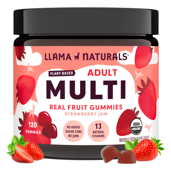 Llama Naturals Adults Organic Multivitamin Gummies provide 13 essential vitamins and phytonutrients made entirely from organic fruits and vegetables. With no added sugar, synthetics, or artificial ingredients, this clean, plant-based formula supports daily energy, immune function, and overall wellness. Made with real strawberries for flavor, these gummies make it simple to get a nutrient boost that feels as good as it tastes.